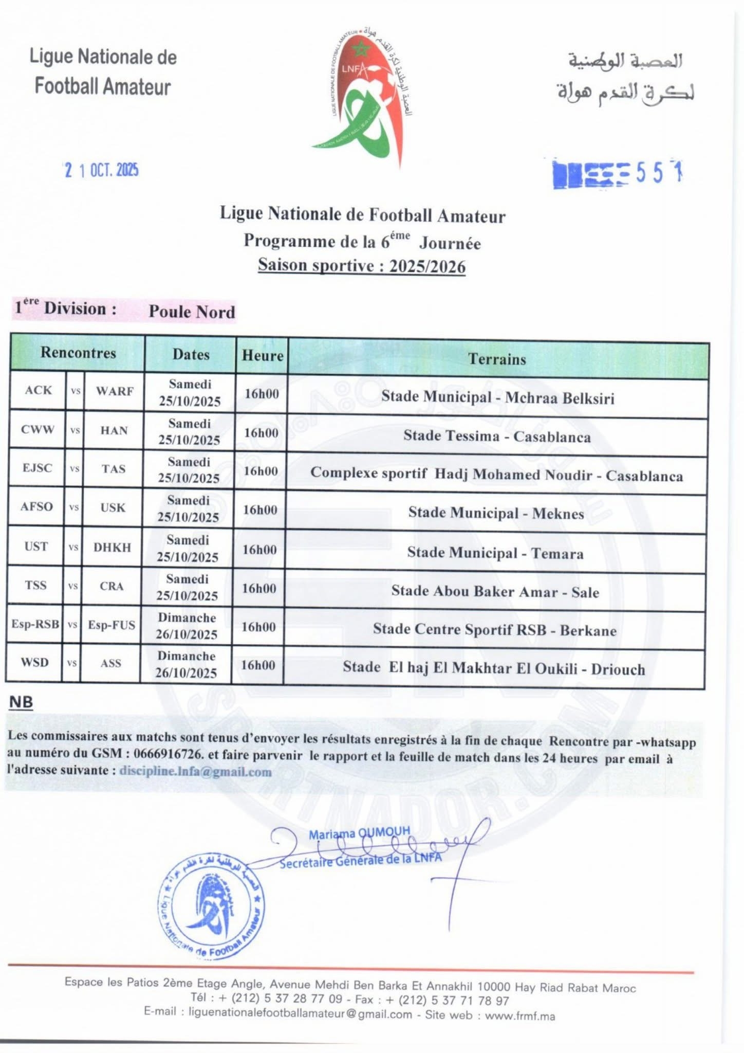 القسم الأول هواة: الهلال الناظوري يواجه المتصدر وفاء وداد ووفاء الدريوش يستقبل جميعة سلا في الجولة السادسة