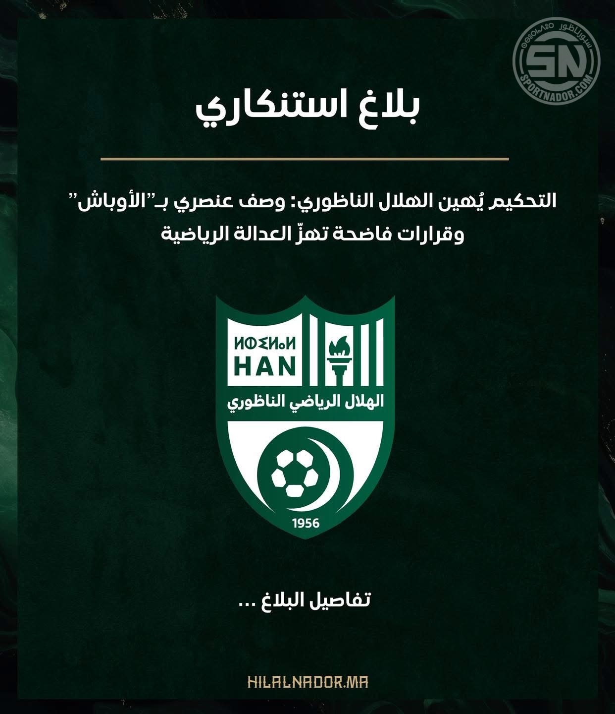 الأخطر في البلاغ – وفق تعبير النادي – أن الحكم وجّه “عبارات عنصرية وقدحية” إلى لاعبي الهلال، من قبيل “الأوباش” و”أولاد العاهرات”، وهي – بحسب البيان – “إهانات تمسّ الكرامة الإنسانية وتعبّر عن نزعة عنصرية تجاه أبناء مدينة الناظور”.