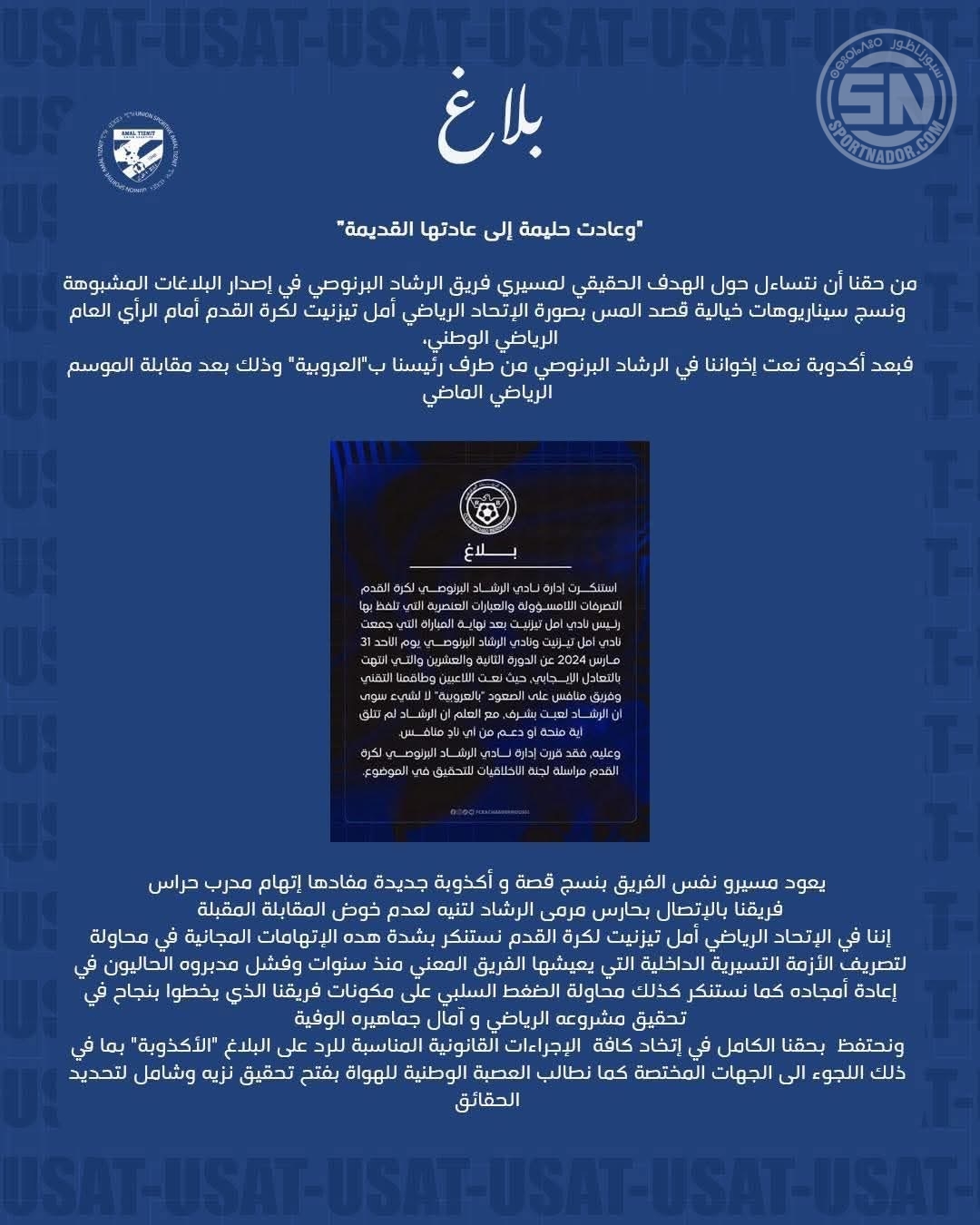في المقابل، سارع نادي أمل تيزنيت إلى الرد عبر بلاغ مضاد، وصف فيه اتهامات الرشاد البرنوصي بأنها “خيالية ومشبوهة”، متسائلاً عن الدوافع الحقيقية وراء هذه “الخرجات المتكررة” التي تهدف – حسب تعبيره – إلى “تشويه صورة النادي السوسي أمام الرأي العام”.