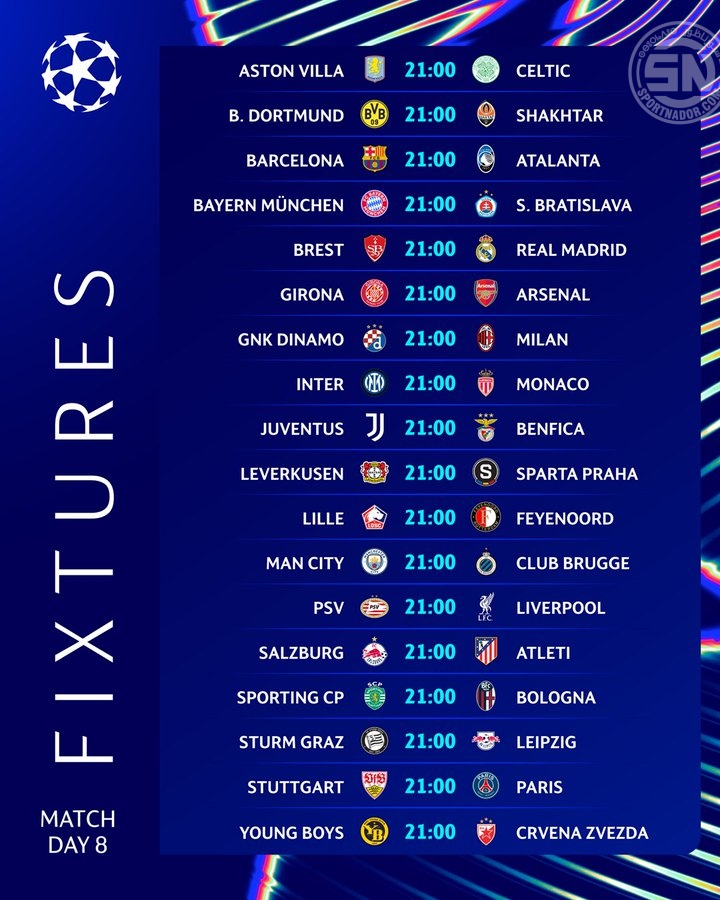 وتتواصل الإثارة بمباريات كلوب بروج ضد مارسيليا، وفرانكفورت أمام توتنهام، وبرشلونة في اختبار أمام كوبنهاغن، بينما يستقبل ليفربول فريق كاراباخ. كما يواجه مانشستر سيتي غلطة سراي، ويلتقي باريس سان جيرمان بنيوكاسل في مواجهة منتظرة، إلى جانب لقاءات قوية أخرى تجمع بين بنفيكا وريال مدريد، ونابولي وتشيلسي، وبي إس في أيندهوفن مع بايرن ميونخ.