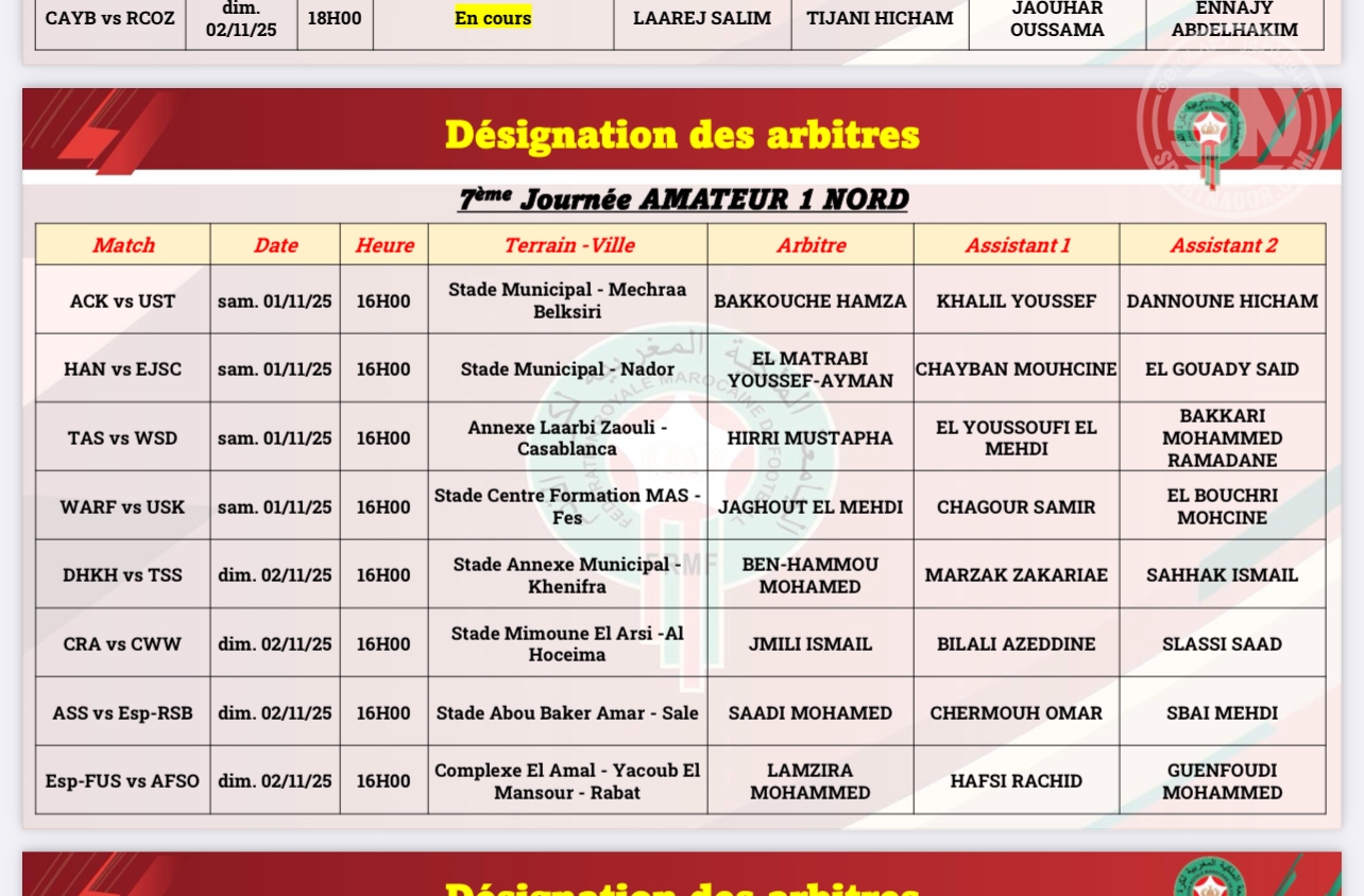 طاقم تحكيم مباراة الهلال الناظوري ونجم شباب البيضاء برسم الجولة السابعة من القسم الأول هواة