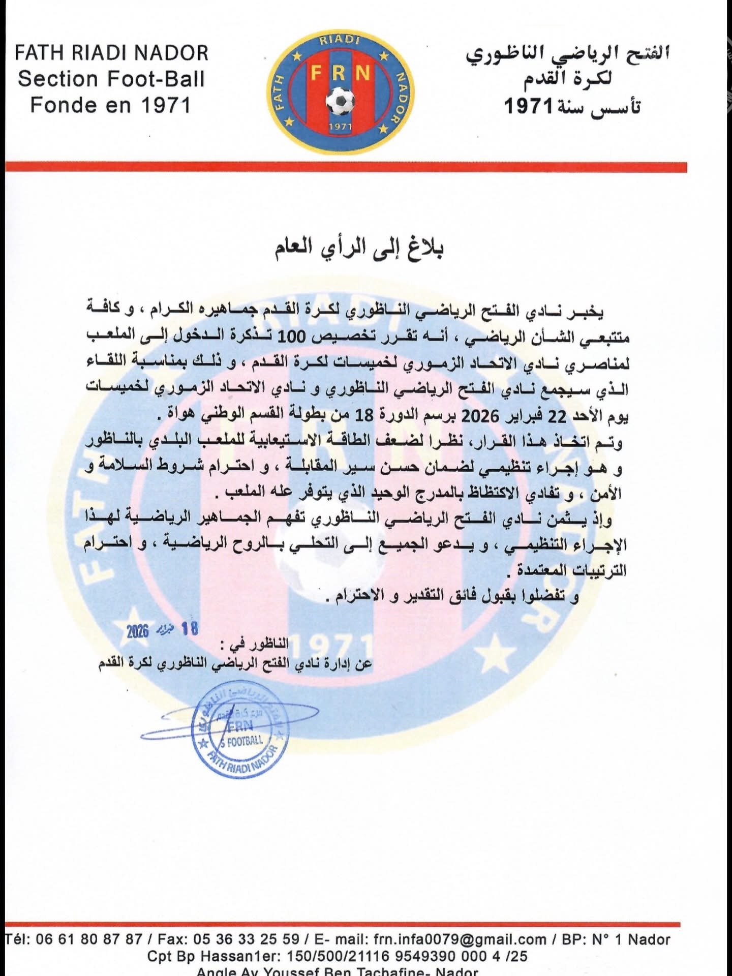 في إطار تعزيز الروابط الرياضية وتشجيع حضور الجماهير لمباريات الفرق الوطنية، أصدر فريق الفتح الرياضي الناظوري بلاغًا للرأي العام يتضمن تخصيص 100 تذكرة لجمهور فريق الاتحاد الزموري الخميسات، وذلك بمناسبة اللقاء المرتقب بين الفريقين.