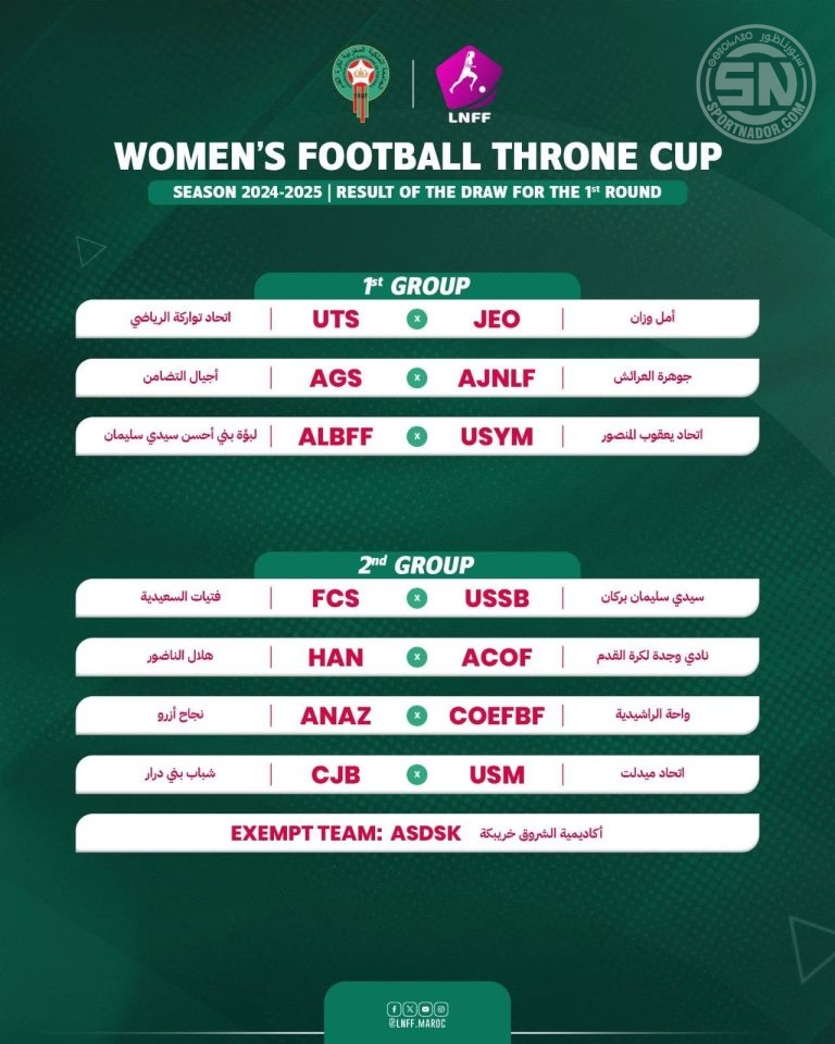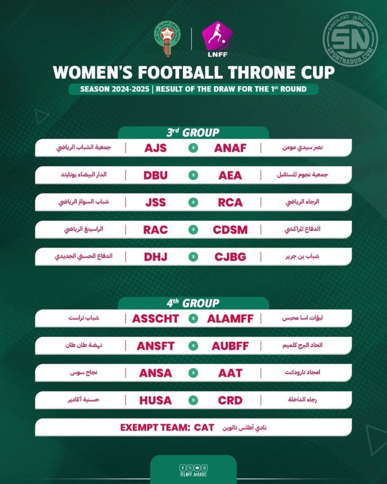 أُجريت اليوم سحب قرعة الدور التمهيدي الأول من مسابقة كأس العرش لكرة القدم النسوية للموسم الرياضي 2025-2024، بمشاركة أندية القسم الوطني الثاني وأندية الهواة، دون تحديد موعد رسمي لإجراء المباريات بعد.