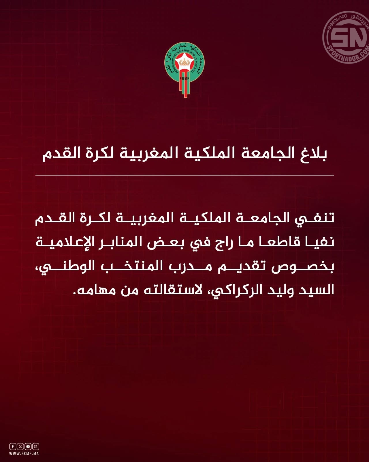 نفت الجامعة الملكية المغربية لكرة القدم، بشكل قاطع، ما تم تداوله في بعض المنابر الإعلامية بخصوص تقديم مدرب المنتخب الوطني، وليد الركراكي، لاستقالته من مهامه، مؤكدة أن هذه الأخبار لا أساس لها من الصحة. وأوضحت الجامعة، عبر بلاغ رسمي، أن الطاقم التقني للمنتخب الوطني يواصل عمله بشكل عادي وفي إطار البرنامج المسطر سلفًا، مشددة على أن مثل هذه الإشاعات لا تخدم مصلحة الكرة الوطنية، وداعية إلى التحري والدقة في نقل الأخبار المرتبطة بالمنتخب الوطني، خاصة في هذه المرحلة التي تعرف تحضيرات مهمة للاستحقاقات المقبلة.